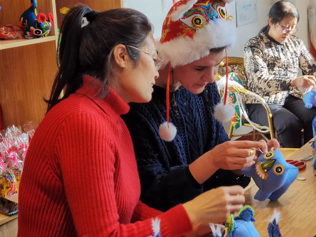 李小梅(左一)在教前来参观的当地外教制作黎侯虎。新华社记者王学涛摄