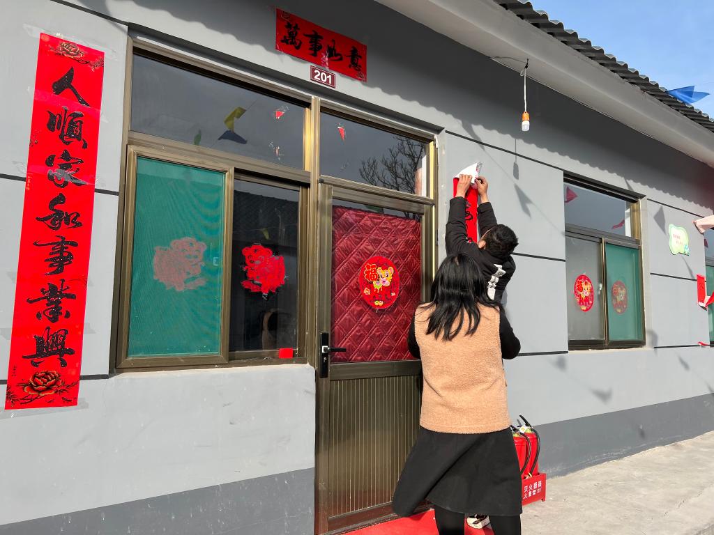 张继鹏和妻子为“新居”贴春联。(新华社记者张磊摄)