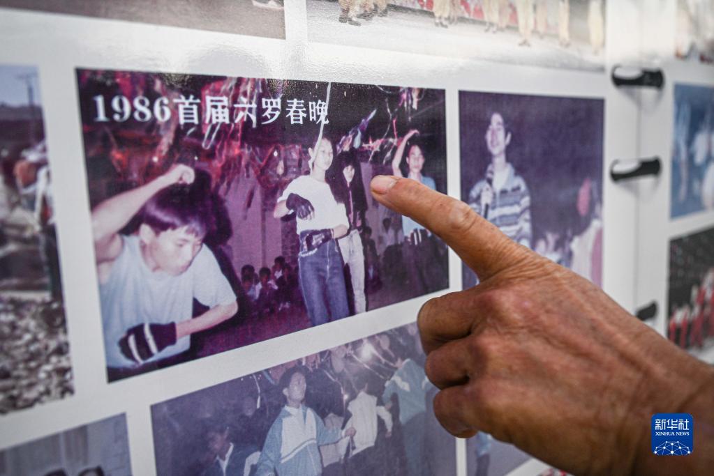 六罗村内张贴着有关该村“乡村春晚”的历史,其中一张照片记录着六罗村1986年举办首届乡村春晚的情景(1月19日摄)。新华社记者 蒲晓旭 摄