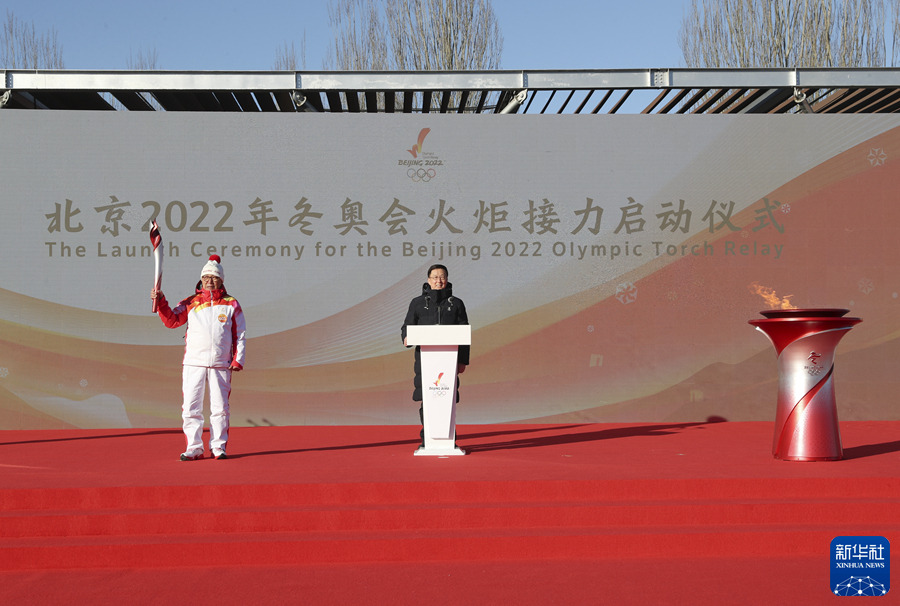 2月2日,北京2022年冬奥会火炬接力启动仪式在北京隆重举行。中共中央政治局常委、国务院副总理、第24届冬奥会工作领导小组组长韩正出席仪式,点燃北京2022年冬奥会火炬,并宣布火炬接力开始。新华社记者 丁海涛 摄