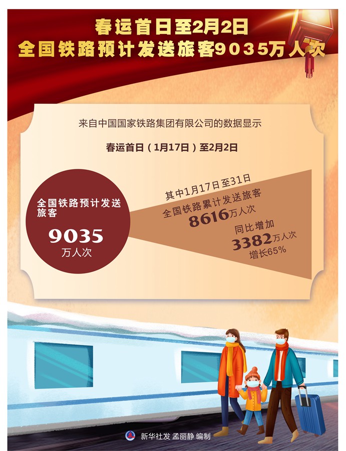 来自中国国家铁路集团有限公司的数据显示,春运首日(1月17日)至2月2日,全国铁路预计发送旅客9035万人次,其中1月17日至31日,全国铁路累计发送旅客8616万人次,同比增加3382万人次,增长65%。