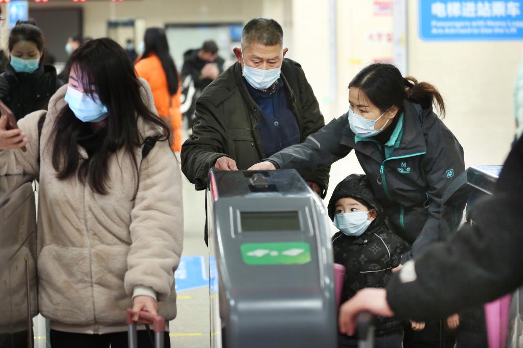 姚婕正在帮助小朋友和老年人进站。 新华社发(产启斗 摄)