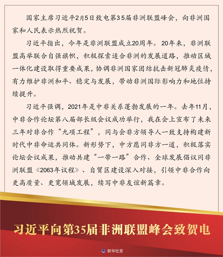 新华社北京2月5日电 国家主席习近平5日致电第35届非洲联盟峰会,向非洲国家和人民表示热烈祝贺。