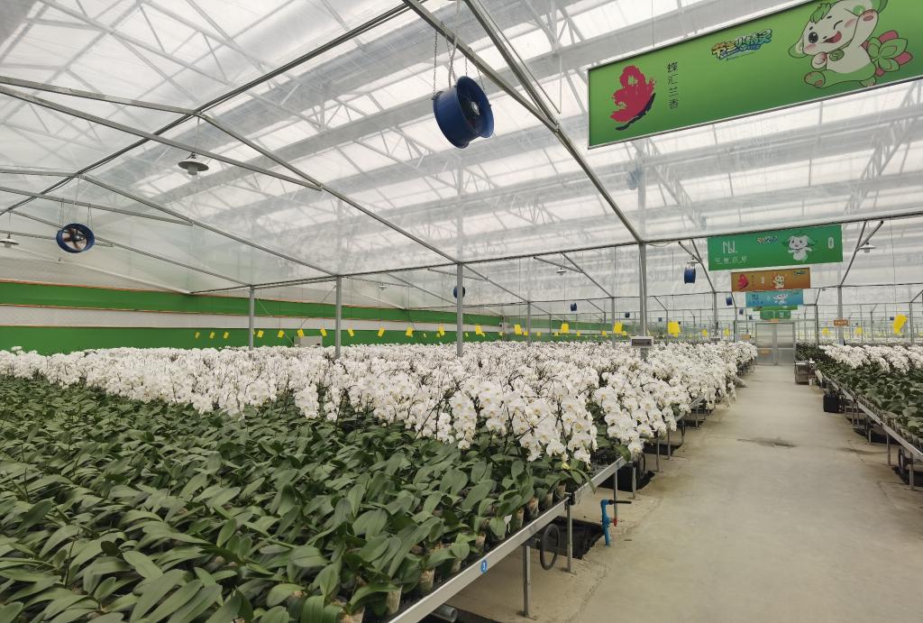 在山东省平度市旧店镇的蝴蝶兰基地内,花床上的一株株蝴蝶兰苗根茎粗壮、叶片肥硕,55万株蝴蝶兰竞相绽放、生机盎然。