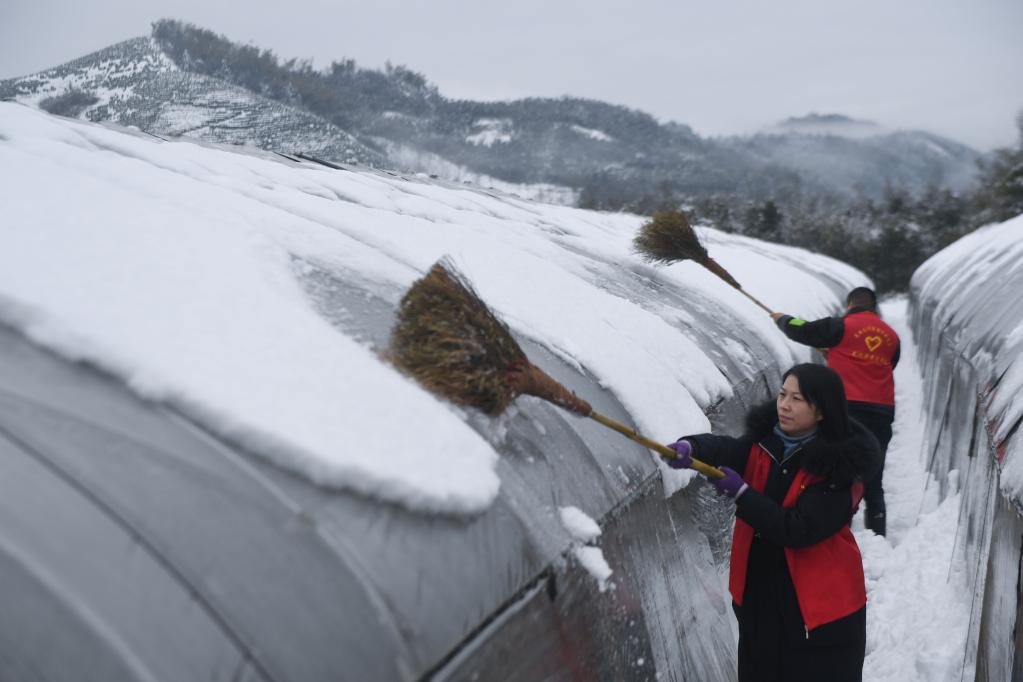 2月7日,杭州市临安区太湖源镇的党员志愿者在蔬菜基地帮助农户清理大棚上的积雪。新华社记者 徐昱 摄
