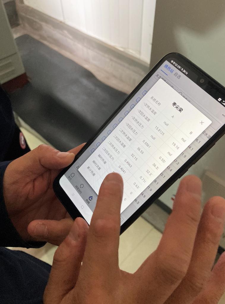 在山西,太原市热力集团太古分公司枣尖梁热力站的供热范围涉及两个小区896户。站长苏程飞通过手机App就可以随时查看热力站的情况,供水温度、回水温度、压力值、热量、流量等数据一目了然。