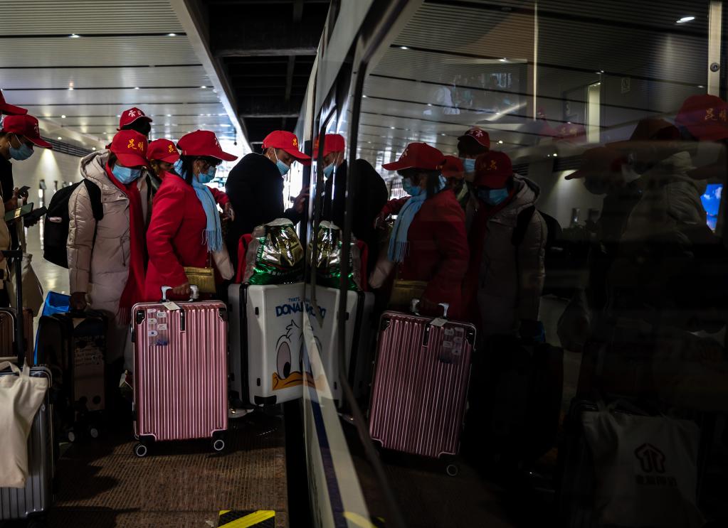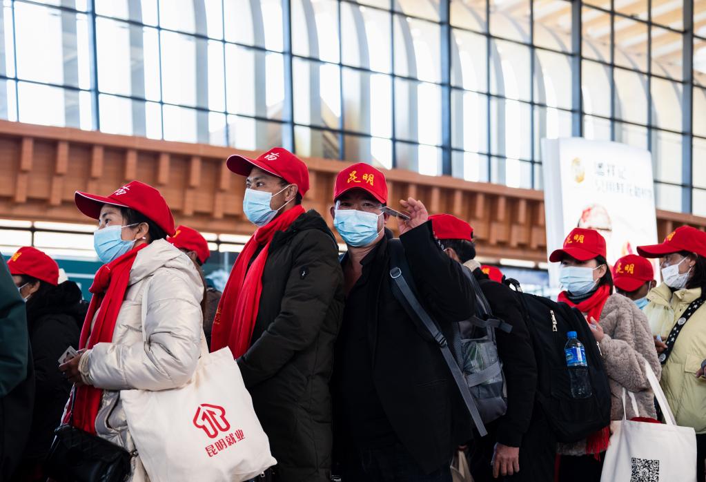 2月8日,昆明南站人潮涌动。昆明市寻甸县鸡街镇泽和村村民张云和妻子张绍芬头戴小红帽,背着行囊,在人社部门、铁路部门工作人员有序组织引导下,和老乡们统一乘坐高铁外出务工。