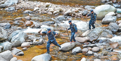 武夷山国家公园,管护人员翻越溪涧巡护山林。记者 王崟欣摄