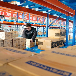 2019年12月20日,在唐山京唐港区保税物流中心,跨境电商企业工作人员在整理货物。新华社记者 杨世尧 摄