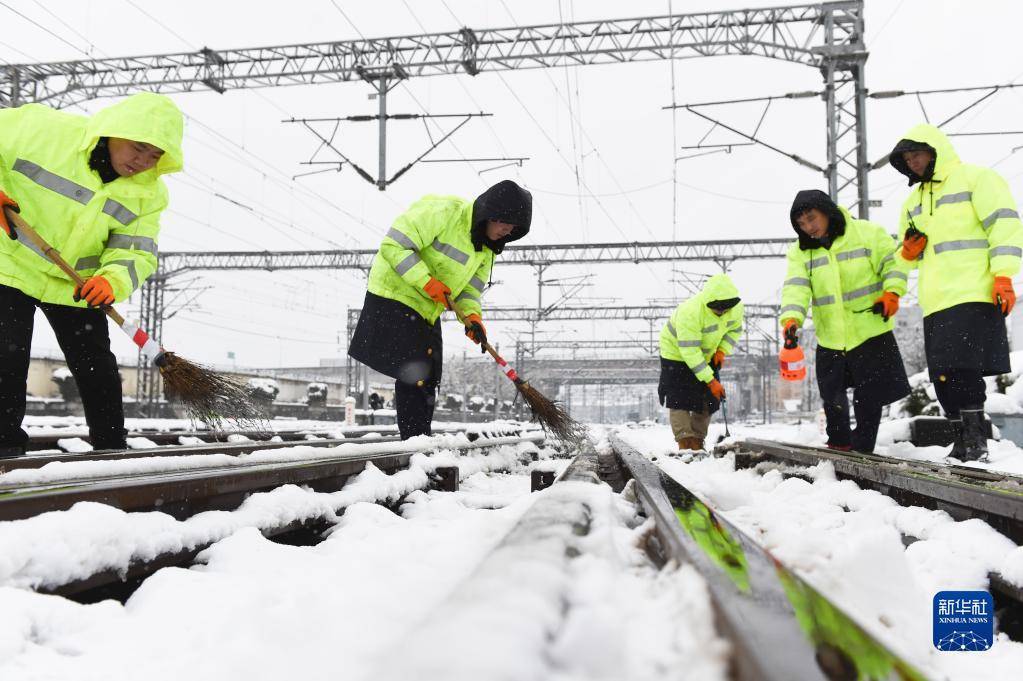 合肥火车站组织工作人员清扫道岔积雪,确保站区铁路设备状态良好,列车接发正常。新华社记者 周牧 摄