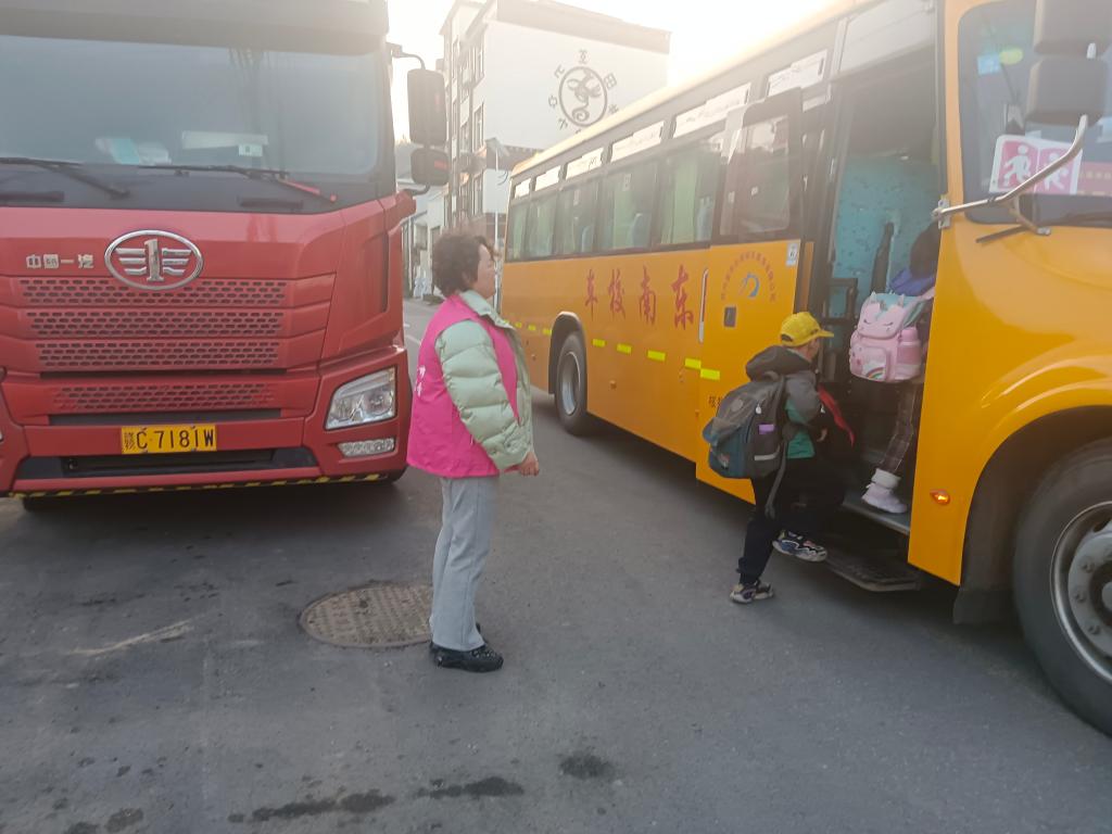 2021年12月2日一早,一位“畲乡嫂”护送小雷上校车。(图片为受访者提供)
