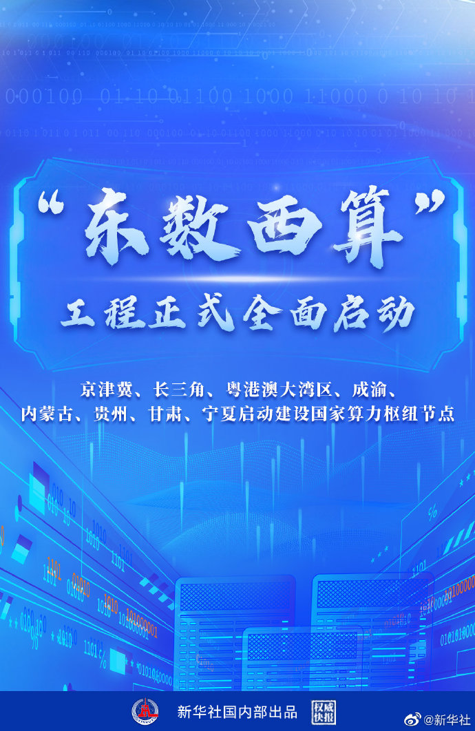 记者17日了解到,国家发展改革委等部门联合印发文件,同意在京津冀、长三角、粤港澳大湾区、成渝、内蒙古、贵州、甘肃、宁夏启动建设国家算力枢纽节点并规划了10个国家数据中心集群。至此,全国一体化大数据中心体系完成总体布局设计,“东数西算”工程正式全面启动。(记者安蓓、严赋憬,海报设计杨轶群)