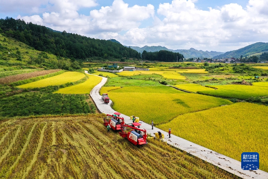 2021年9月15日,贵州省龙里县湾滩河镇羊场社区的农民在抢收稻谷(无人机照片)。 新华社记者 杨文斌 摄