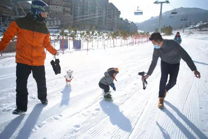2021年冬,新华社记者杨帆(右)在崇礼太舞滑雪小镇拍摄萌宝滑雪。
