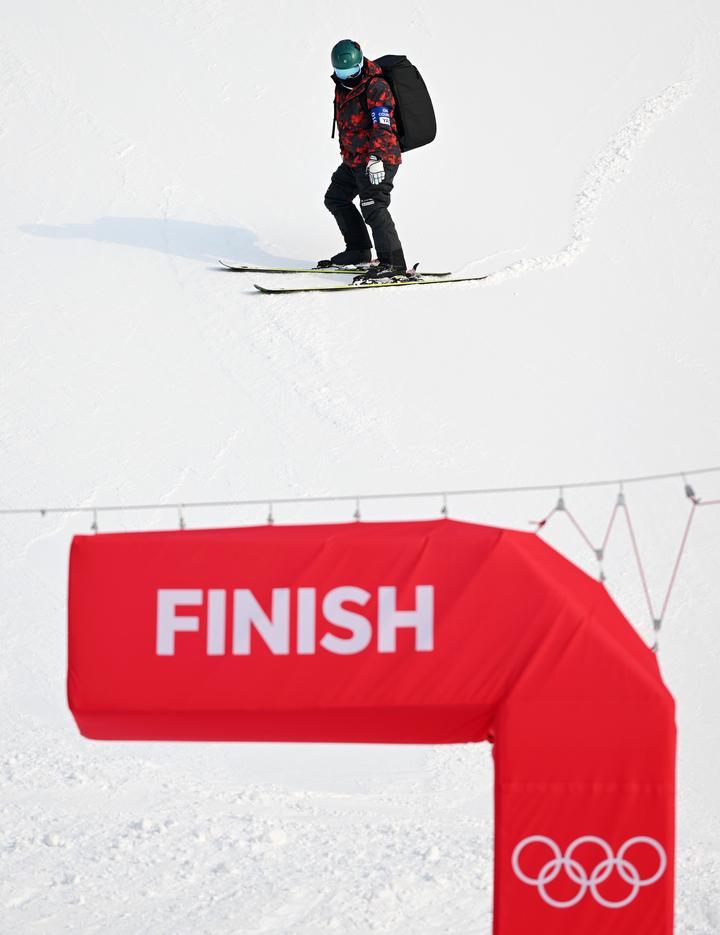 2月9日,在国家高山滑雪中心进行的比赛结束后,新华社记者陈益宸从赛道上滑下。