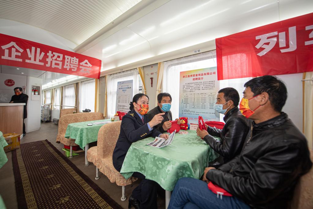 2月18日,列车员向旅客介绍企业招聘信息。新华社记者江汉摄