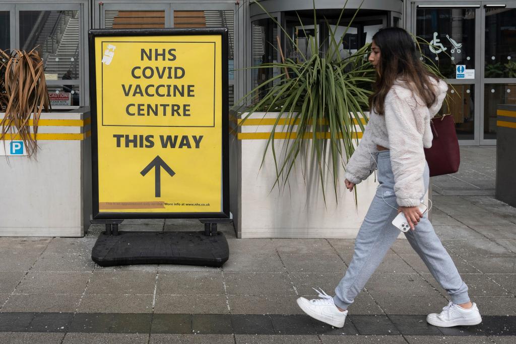 2022年1月28日,一名女子从英国伦敦一家新冠疫苗接种中心门外走过。(新华社发,雷伊·唐摄)