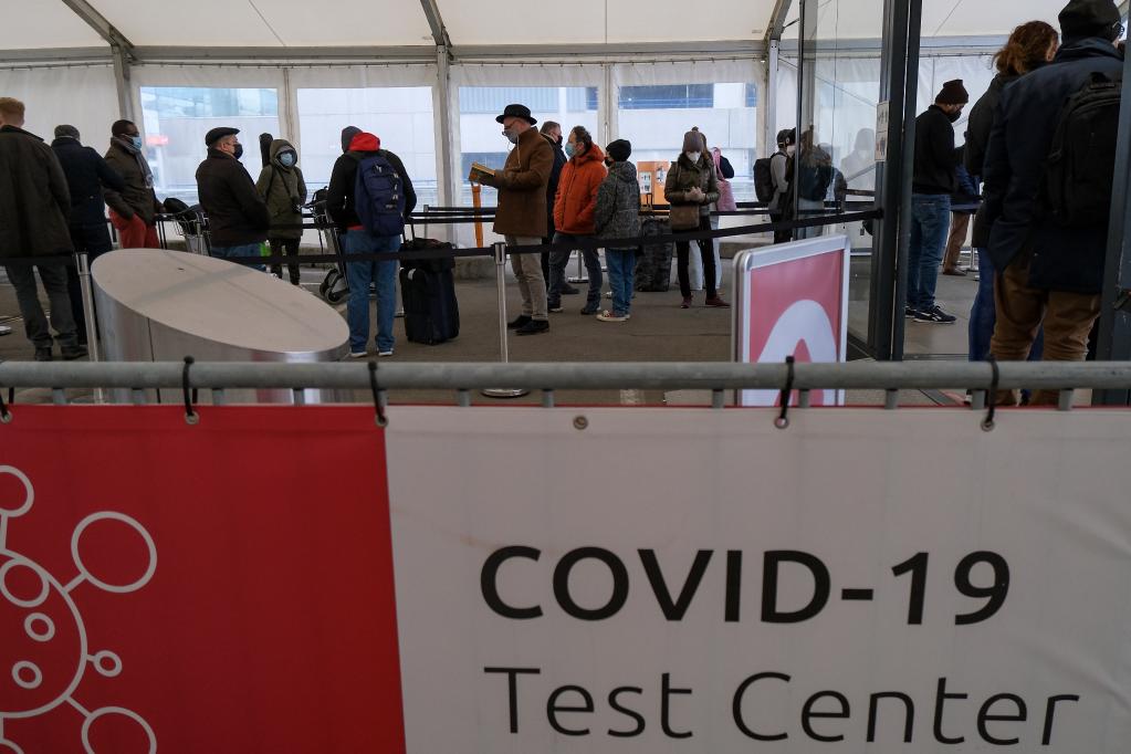 2022年1月8日,在比利时布鲁塞尔国际机场的新冠检测中心,人们等待做检测。(新华社记者张铖摄)