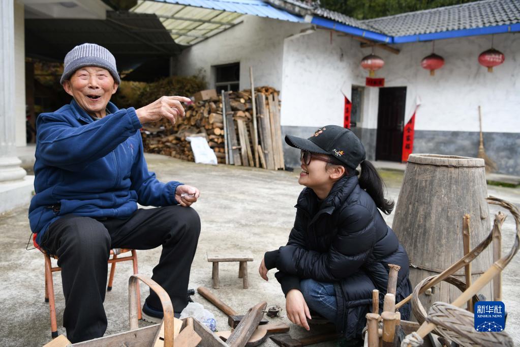 刘琳(右)计划在万涧村杨家老屋进行传统农具的展示,这是她前往村民家收集老物件(2021年3月27日摄)。