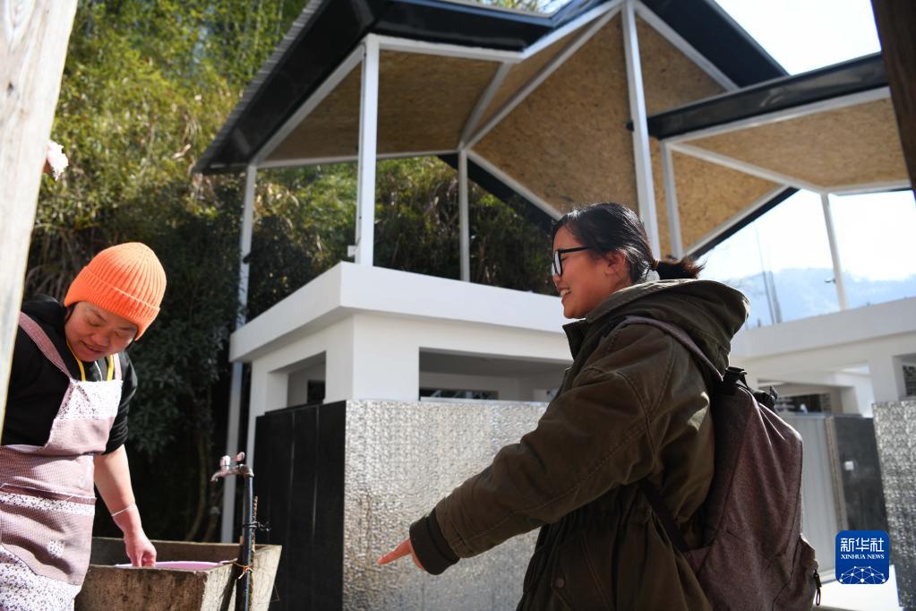 2月24日,刘琳与万涧村村民交流,身后是刘琳参与规划设计的厕所。