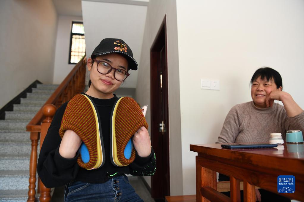 刘琳(左)在万涧村村民冯青秀家中展示冯青秀特意为自己织的一双鞋(2021年3月26日摄)。