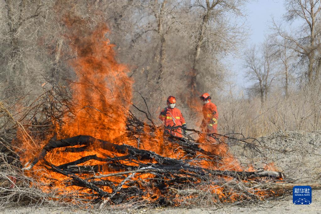 在尉犁县一处胡杨林里,森林草原应急分队成员进行班组灭火行动训练(2月22日摄)。