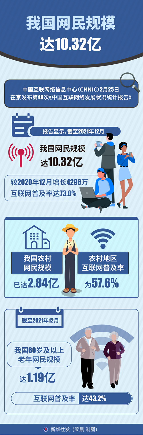 新华社北京2月25日电(记者王思北)中国互联网络信息中心(CNNIC)25日在京发布第49次《中国互联网络发展状况统计报告》。报告显示,截至2021年12月,我国网民规模达10.32亿,较2020年12月增长4296万,互联网普及率达73.0%。