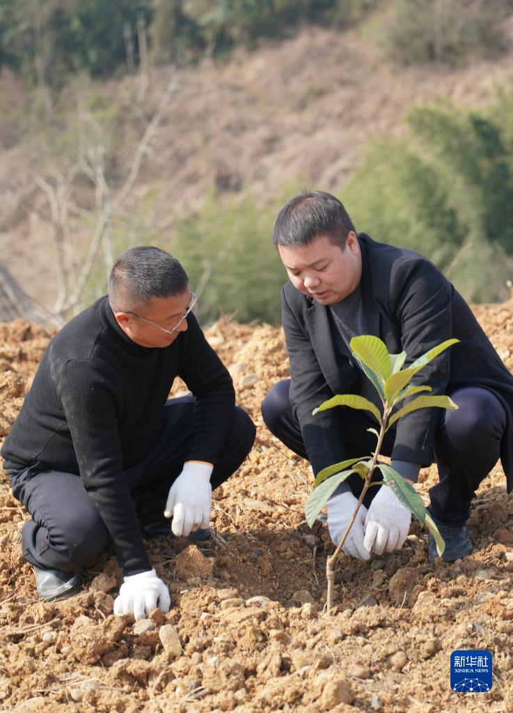 2月25日,汉滨区建民街道青春村支部副书记唐振(右)在村子产业园种植枇杷树。