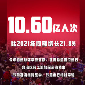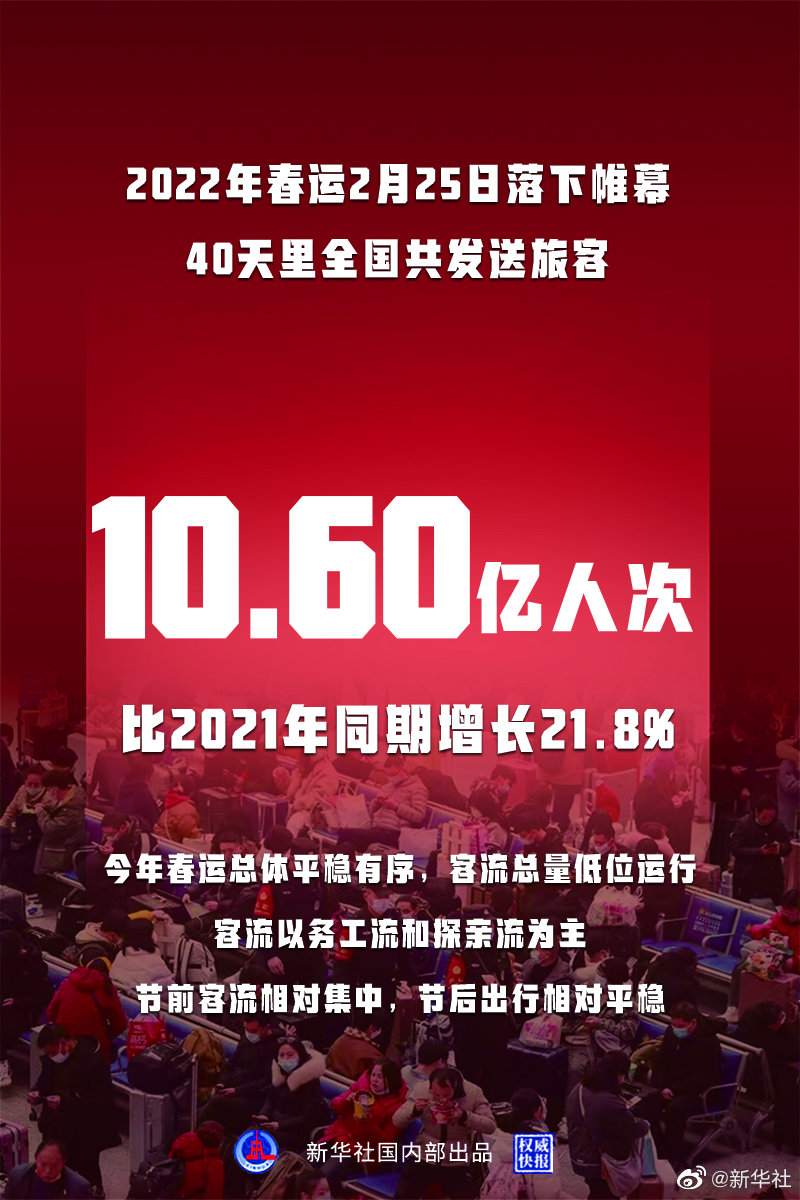 2022年春运2月25日落下帷幕,40天里全国共发送旅客10.60亿人次,比2021年同期增长21.8%。今年春运总体平稳有序,客流总量低位运行,客流以务工流和探亲流为主,节前客流相对集中,节后出行相对平稳。(记者叶昊鸣、樊曦、周圆,海报设计胡戈)