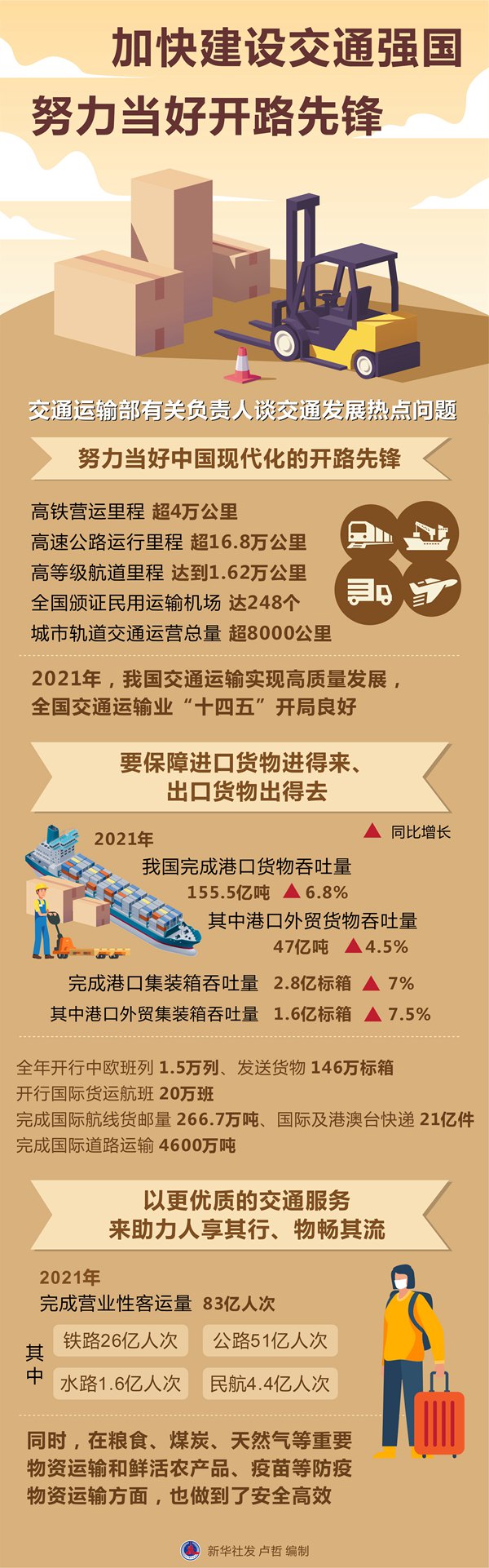 李小鹏表示,2022年预计将新增铁路新线3300公里以上,新改扩建高速公路8000公里以上,新增及改善高等级航道700公里以上,新增颁证民用运输机场8个。“我们将全力以赴加快建设交通强国,努力当好中国现代化的开路先锋。”