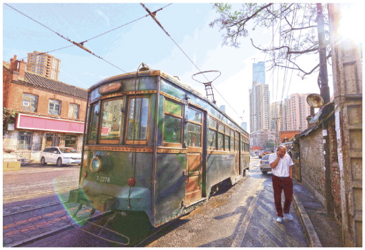一辆有轨电车穿行在大连市西岗区日新街道东关街。上世纪初,东关街一带是大连地标性街区。(新华社资料片)