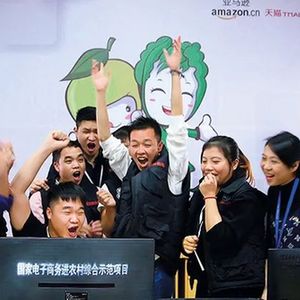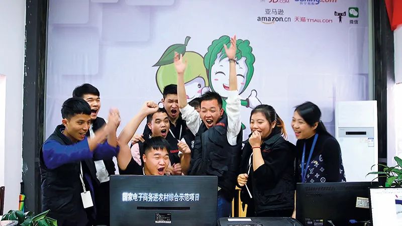 2021年5月8日,广西融安蚂蚁农业发展有限公司云仓,返乡创业青年韦小东(右三)和团队成员庆祝网上订单成功签约。张爱林 摄