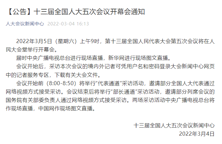 2022年3月5日(星期六)上午9时,第十三届全国人民代表大会第五次会议将在人民大会堂举行开幕会。