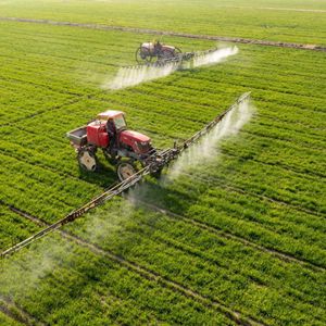 3月9日,在山东省聊城市茌平区菜屯镇任庄村,村民驾驶拖拉机给小麦喷施除草药物(无人机照片)。新华社发(赵玉国 摄)