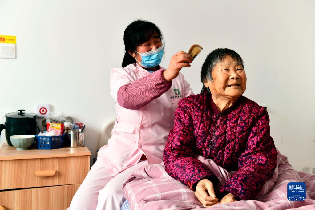在山东省日照市岚山区黄墩镇“如康家园”残疾人之家,工作人员为老人梳头(3月1日摄)。新华社记者 郭绪雷 摄
