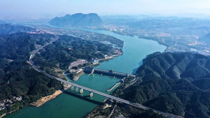 这是广西柳州市融安县浮石水电站景色(2021年12月4日摄,无人机照片)。新华社记者 张爱林 摄