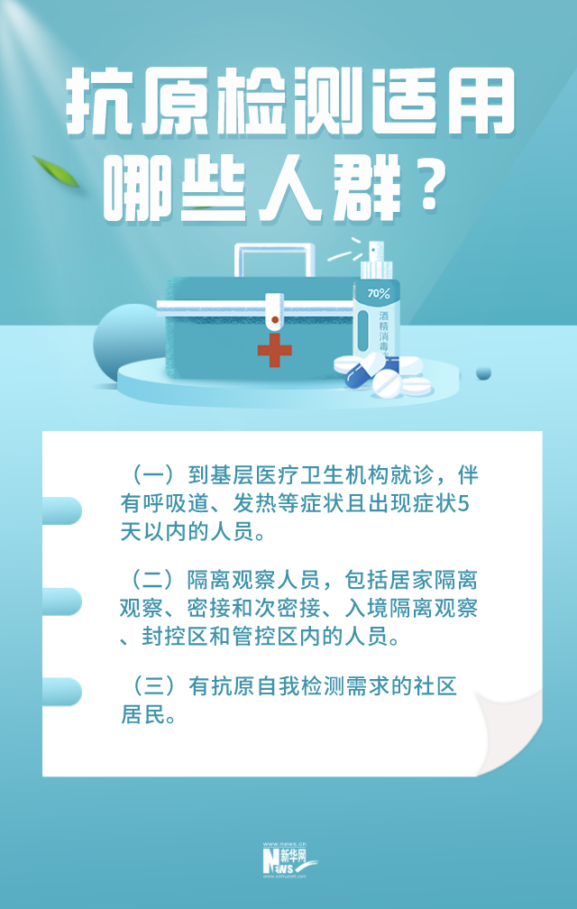 根据《新冠病毒抗原检测应用方案(试行)》,抗原检测适用人群主要有以下三类: