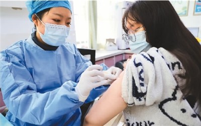 图为1月27日,江苏省连云港市海州区浦西社区卫生服务中心,医务人员在给女大学生接种九价HPV疫苗。耿玉和摄(人民视觉)