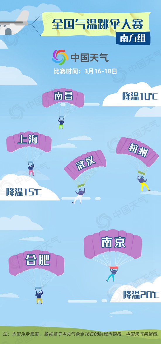 南方组“跳伞”大赛稍晚开赛,但刺激程度不输北方。中国天气网气象分析师张娟介绍,目前南方大部仿佛在过夏天,像今天江南一带最高气温还接近30℃左右,多地热如6月,但明天降温开启后,气温将直线下滑,江苏、安徽等不少地方还将出现气温倒降,午后冷过早晨。