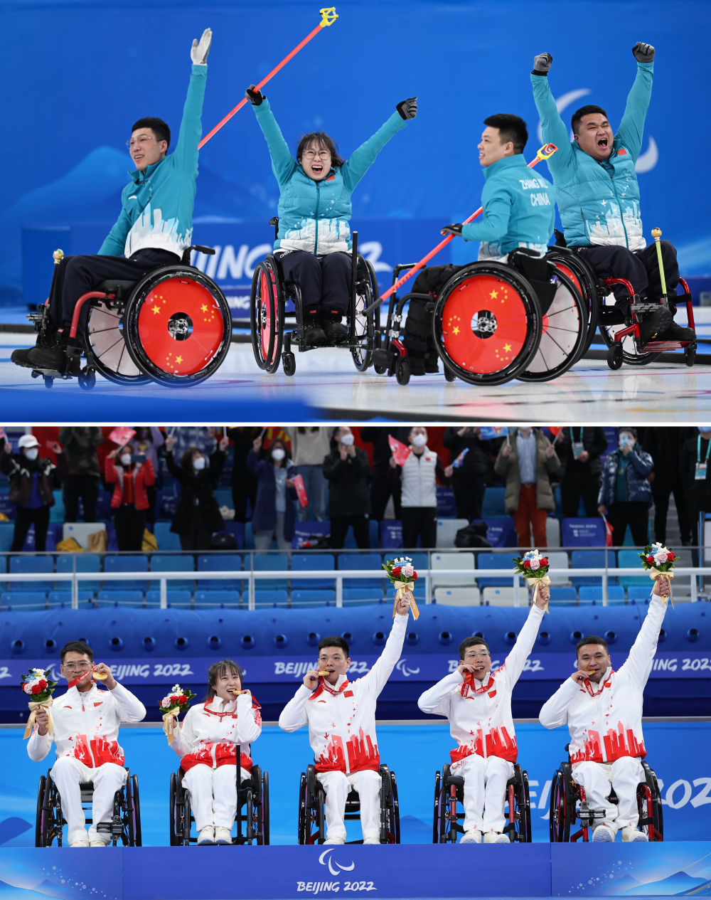 ↑3月12日,在北京国家游泳中心“冰立方”举行的北京2022年冬残奥会轮椅冰壶金牌赛中,中国队以8比3战胜瑞典队,夺得冠军。这是拼版照片:上图为中国队选手陈建新、闫卓、张明亮和王海涛(从左至右)庆祝夺冠(新华社记者李尕摄);下图为中国队选手孙玉龙、闫卓、张明亮、陈建新和王海涛(从左至右)在颁奖仪式上。(新华社记者杜潇逸摄)