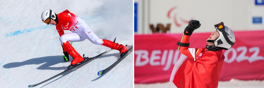 ↑3月6日,在延庆国家高山滑雪中心举行的北京2022年冬残奥会残奥高山滑雪男子超级大回转(站姿)比赛中,中国选手梁景怡夺得金牌。这是拼版照片:左图为梁景怡在残奥高山滑雪男子超级大回转(站姿)比赛中(新华社记者江汉摄);右图为梁景怡在比赛后庆祝夺冠。(新华社记者孙非摄)