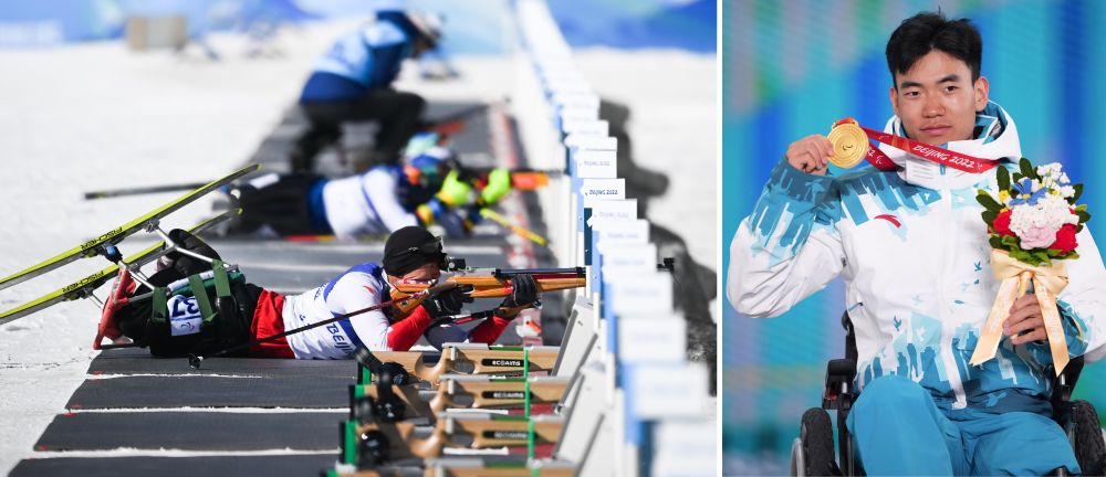 ↑3月5日,在河北张家口国家冬季两项中心举行的北京2022年冬残奥会残奥冬季两项男子短距离(坐姿)比赛中,中国选手刘子旭夺得金牌。这是拼版照片:左图为刘子旭在残奥冬季两项男子短距离(坐姿)比赛中(新华社记者薛宇舸摄);右图为刘子旭在颁奖仪式上展示金牌。(新华社记者彭子洋摄)