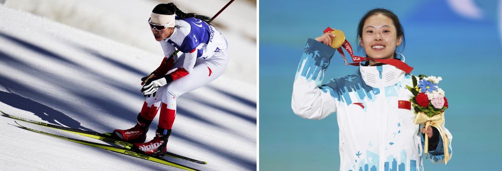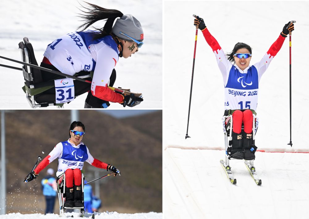 ↑北京冬残奥会期间,中国选手杨洪琼包揽了残奥越野滑雪女子坐姿组短距离、中距离、长距离3个项目的金牌。这是拼版照片:左上图为3月6日,杨洪琼在残奥越野滑雪女子长距离(坐姿)比赛中(新华社记者薛宇舸摄);左下图为3月12日,杨洪琼在残奥越野滑雪女子中距离(坐姿)比赛中(新华社记者赵子硕摄);右图为3月9日,杨洪琼在残奥越野滑雪女子短距离(坐姿)比赛后庆祝。(新华社记者王曦摄)