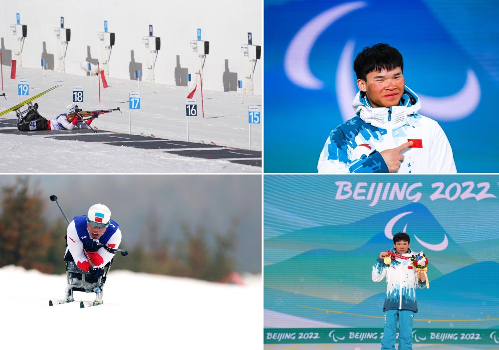 ↑北京冬残奥会期间,中国选手刘梦涛夺得残奥冬季两项男子中距离(坐姿)和男子长距离(坐姿)比赛金牌。这是拼版照片:左上图为3月8日,刘梦涛在残奥冬季两项男子中距离(坐姿)比赛中(新华社记者万象摄),右上图为刘梦涛在颁奖仪式上庆祝(新华社记者颜麟蕴摄);左下图为3月11日,刘梦涛在残奥冬季两项男子长距离(坐姿)比赛中(新华社记者贾浩成摄),右下图为刘梦涛在颁奖仪式上庆祝。(新华社记者赵子硕摄)