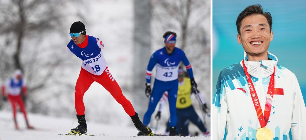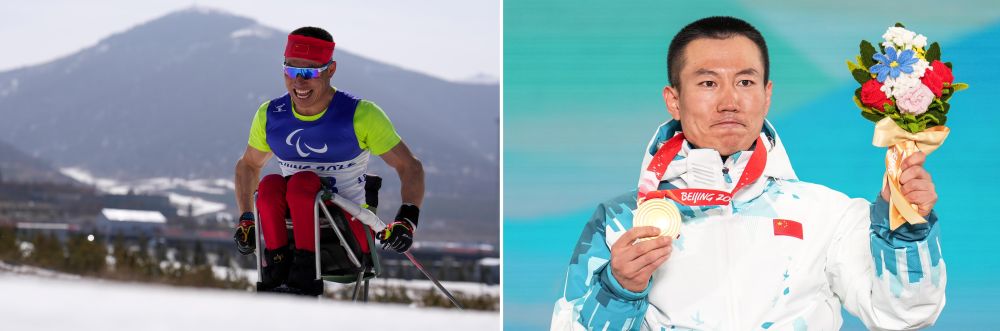 ↑3月12日,在河北张家口国家冬季两项中心举行的北京2022年冬残奥会残奥越野滑雪男子中距离(坐姿)比赛中,中国选手毛忠武夺得金牌。这是拼版照片:左图为毛忠武在残奥越野滑雪男子中距离(坐姿)比赛中(新华社记者胡虎虎摄);右图为毛忠武在颁奖仪式上。(新华社记者彭子洋摄)