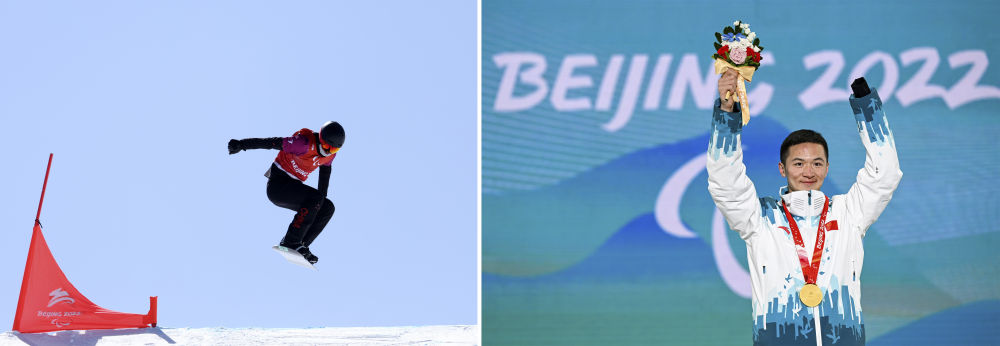 ↑3月11日,在张家口云顶滑雪公园举行的北京2022年冬残奥会残奥单板滑雪男子坡面回转(LL2级)比赛中,中国选手孙奇夺得金牌。这是拼版照片:左图为孙奇在残奥单板滑雪男子坡面回转(LL2级)比赛中(新华社记者许畅摄);右图为孙奇在颁奖仪式上。(新华社记者胡虎虎摄)