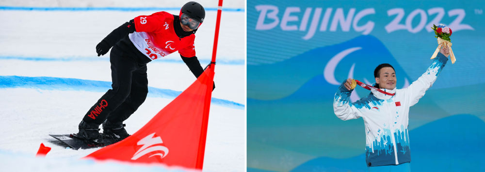 ↑3月12日,在张家口云顶滑雪公园举行的北京2022年冬残奥会残奥单板滑雪男子坡面回转(LL1级)比赛中,中国选手武中伟夺得金牌。这是拼版照片:左图为武中伟在残奥单板滑雪男子坡面回转(LL1级)比赛中(新华社记者颜麟蕴摄);右图为武中伟在颁奖仪式上。(新华社记者胡虎虎摄)