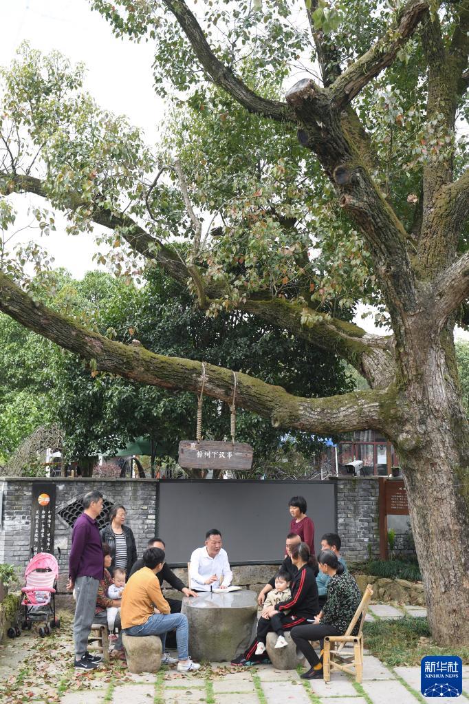 3月14日,杭州市余杭区小古城村一株老樟树下,村民在商议乡村发展事项。新华社记者 翁忻旸 摄