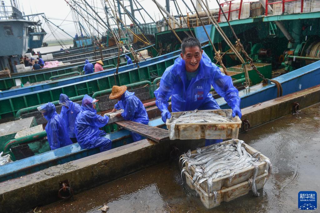 台州市三门县健跳渔港码头,渔民从归港的渔船上卸下渔获(2021年9月12日摄)。新华社发(林利军摄)