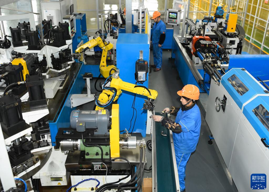 在位于湖州市吴兴区八里店镇的金洲管道科技股份有限公司,工作人员和智能机器人协作生产不锈钢管件(2月14日摄)。新华社记者 翁忻旸 摄